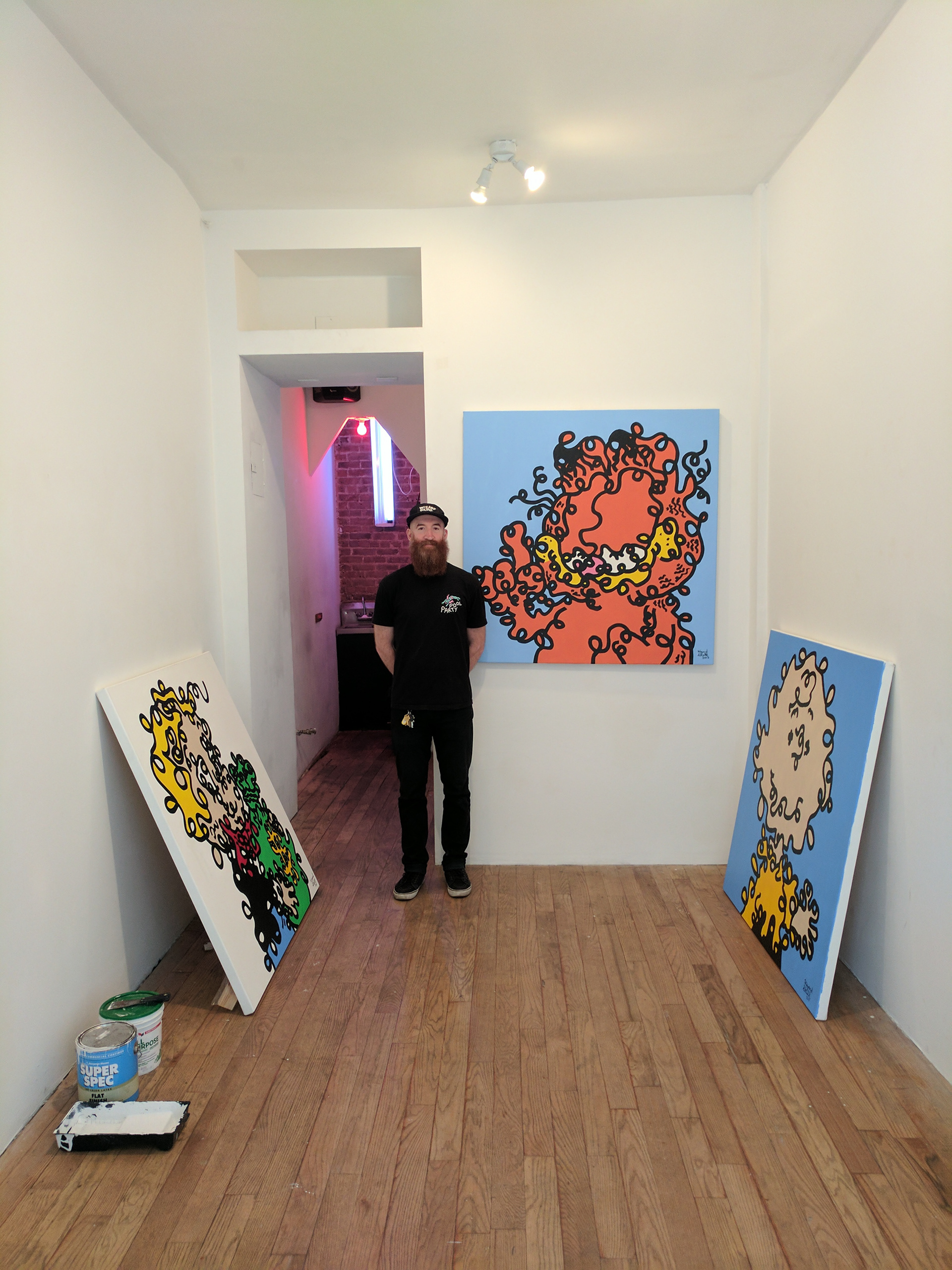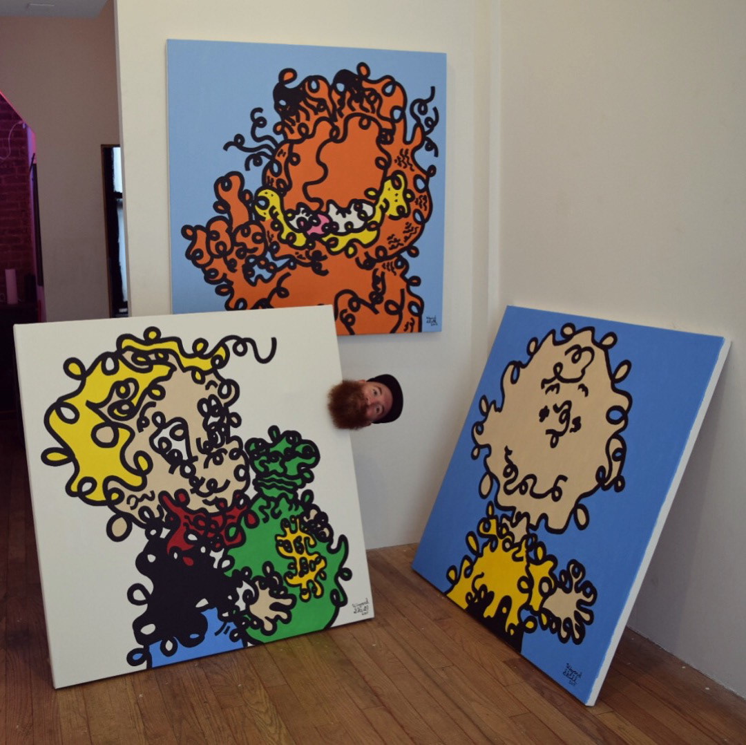 "Anything But Straight" features a new series of paintings in which Wizard Skull explores how far an abstract line can wiggle, curve, double over, and go anywhere but along a straight path, while still being able to portray the idea of the cartoon characters we are familiar with. The work below consists of paintings from a 3 day live painting/showing at Lazy Susan Gallery in LES, NYC in March of 2017